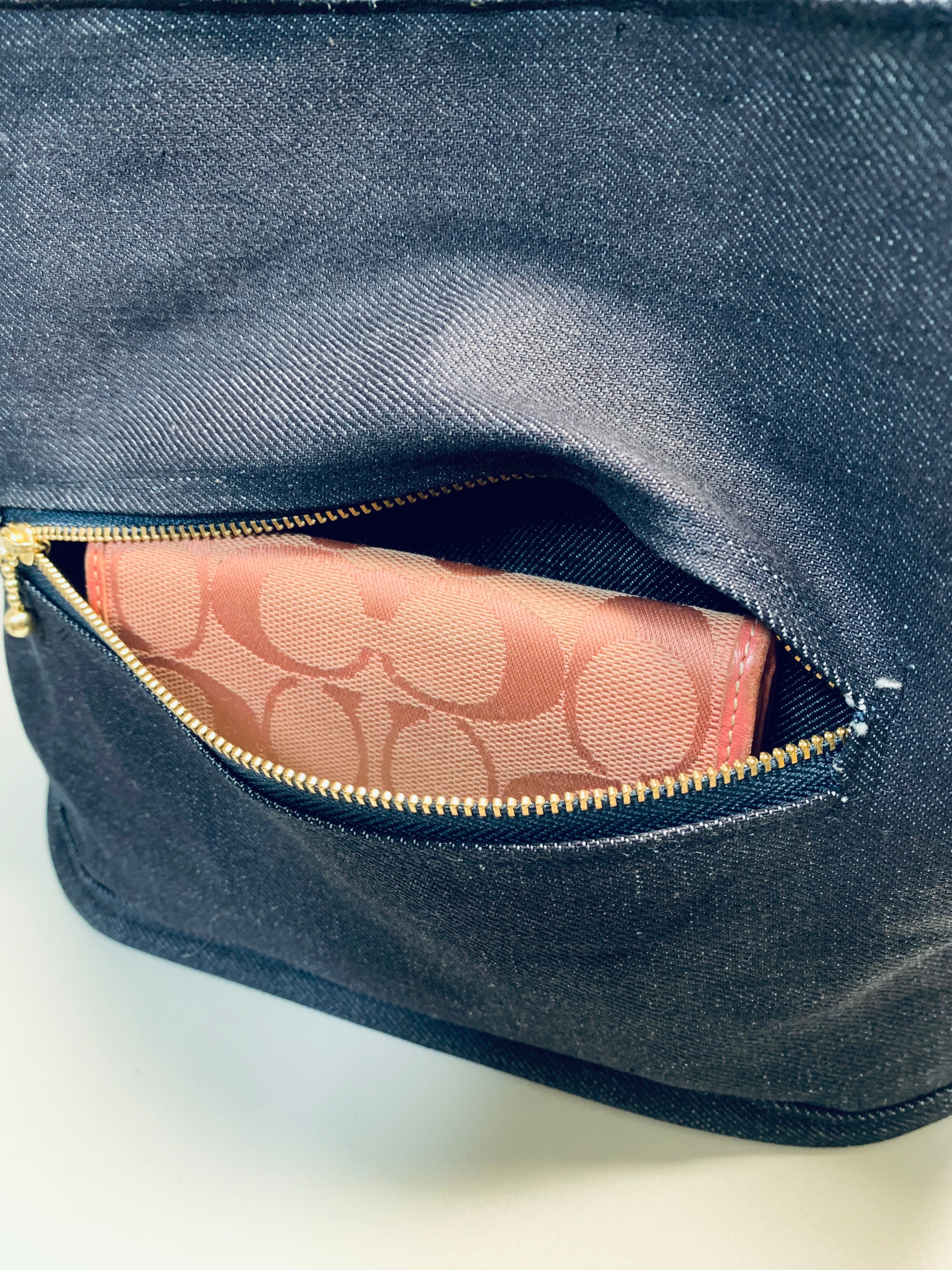 サイズもコンパクト、ファスナー付きポケットが表裏とあり、小物など入れるのにも持ち運びにも便利です。
