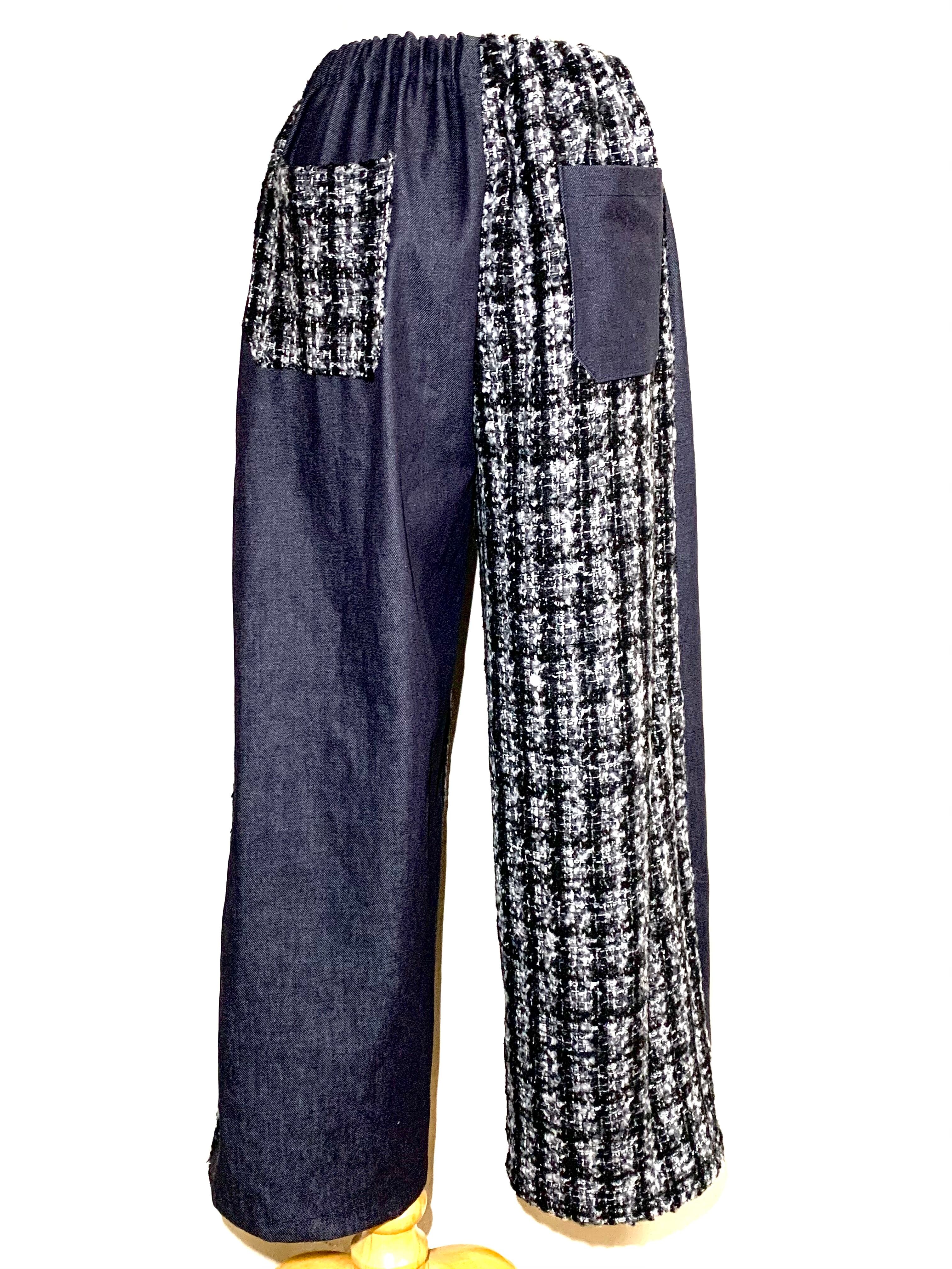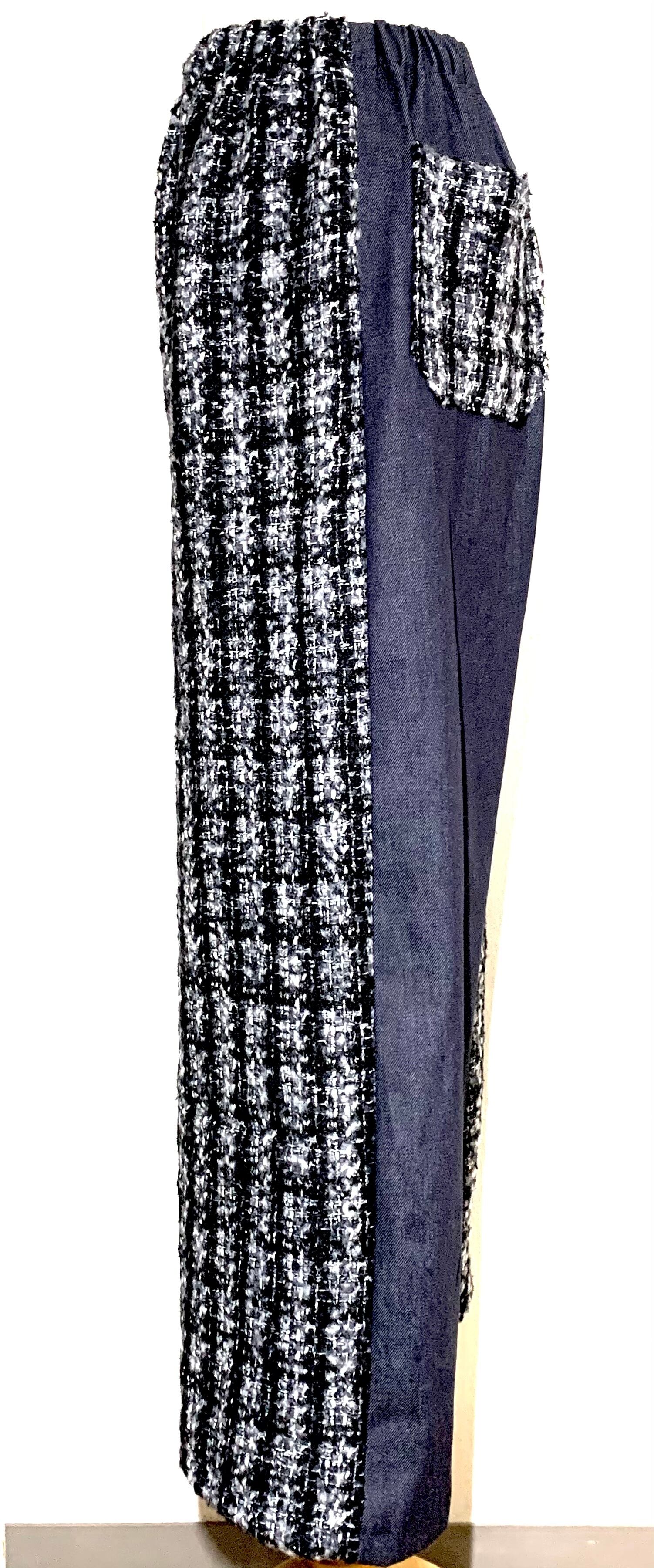 ◾️岡山県産の高級児島デニムとデザイン性のあるチェックウールを組み合わせたアシンメトリーデザインでカジュアル性抜群、ゆったりとしたシルエット、ウエストゴムによる履きやすさ、コーディネートのしやすさも兼ね備えたし現品のみのワイドパンツになります♪