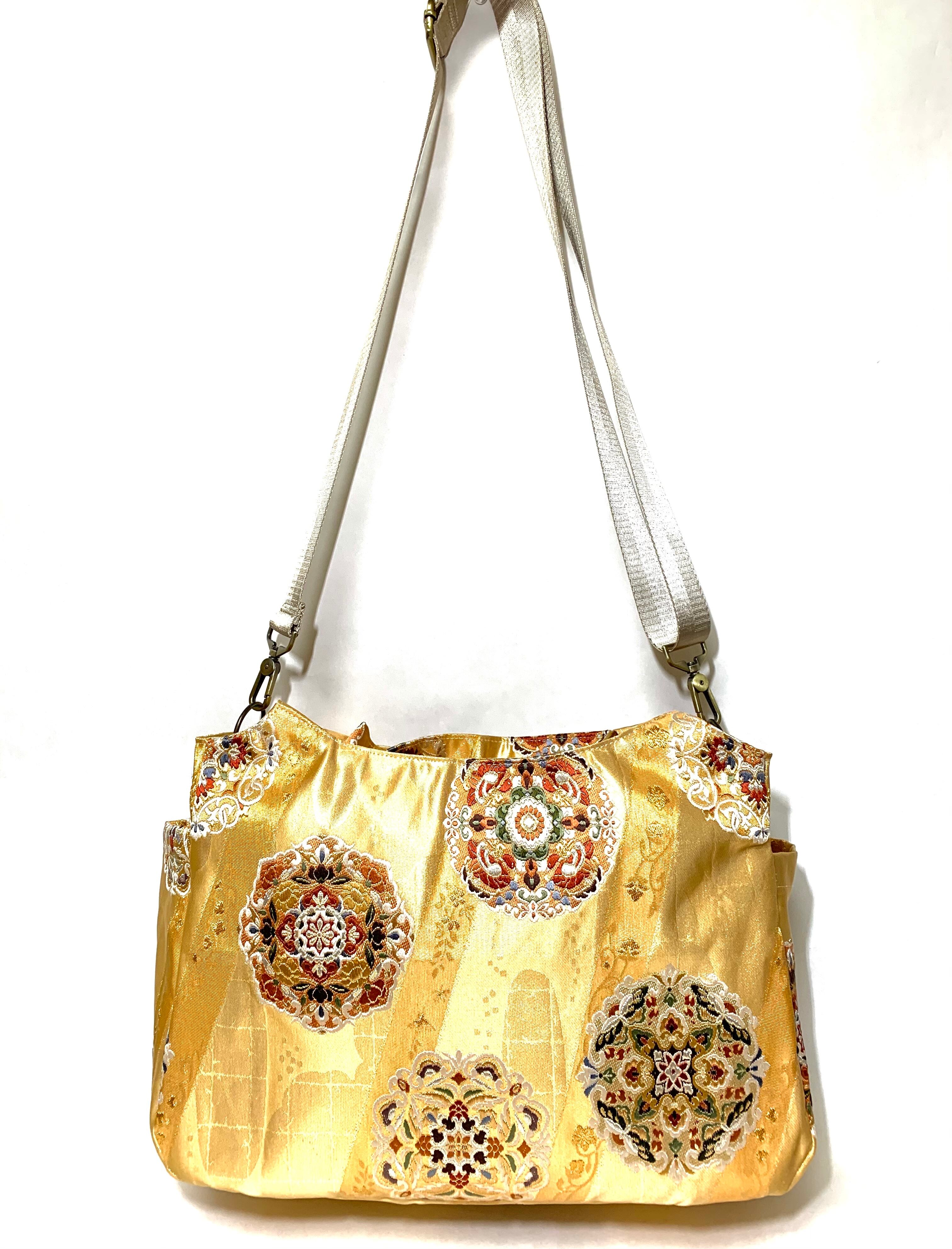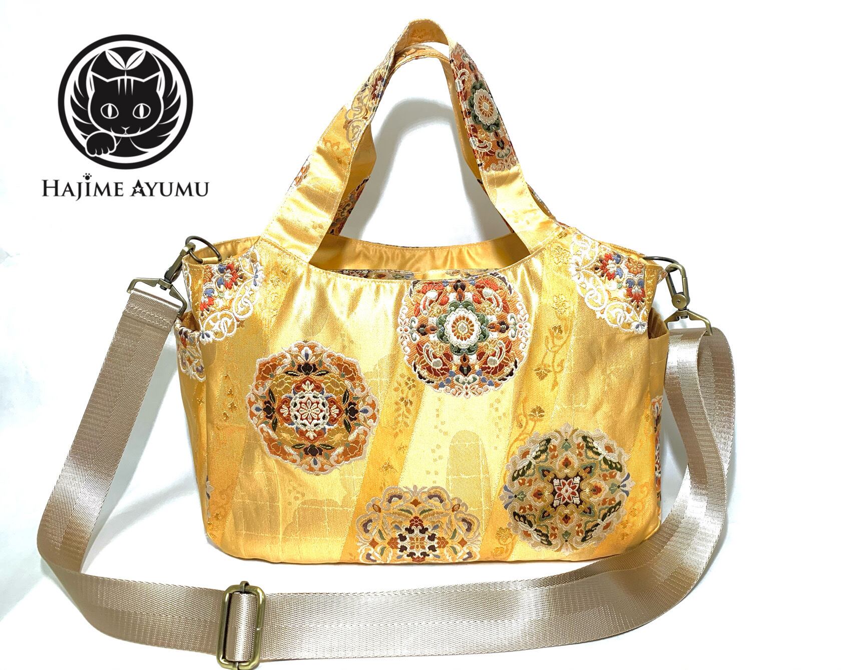 ◾️【現品限り】HAJIME AYUMU 高級柄付き2WAY 着物帯リメイクバッグ ゴールド ハンドメイド ファッション 和風 鞄 ショルダーバッグ