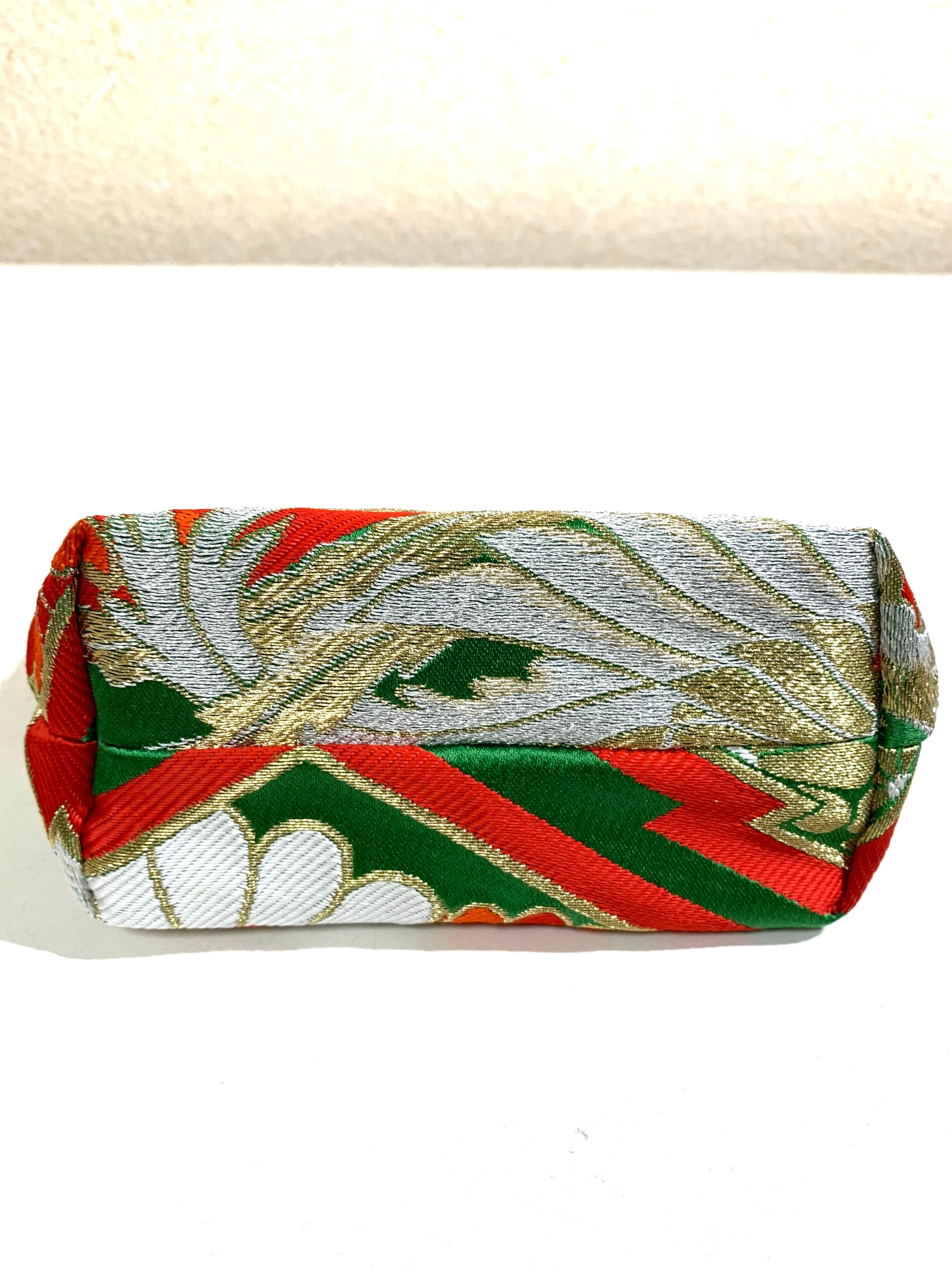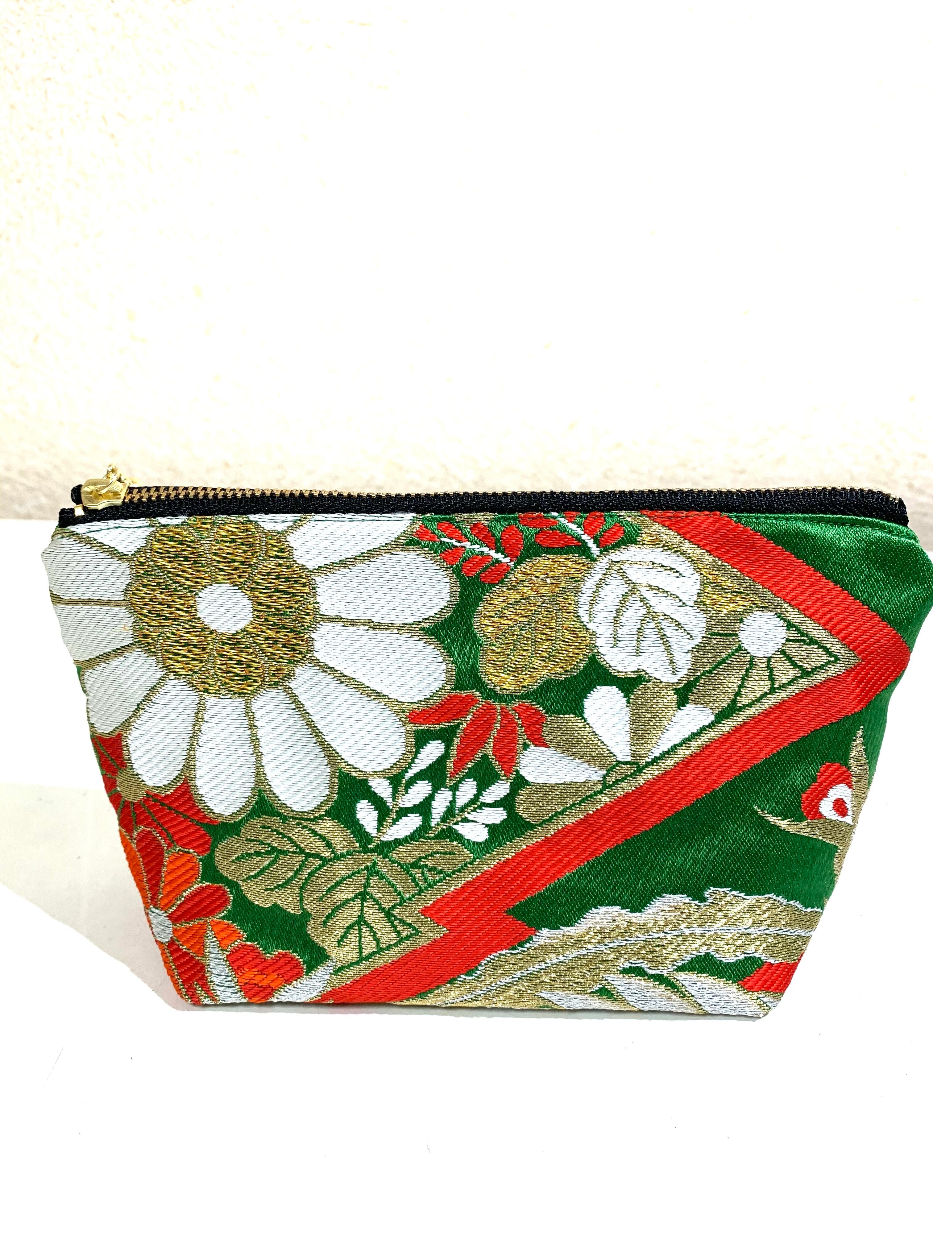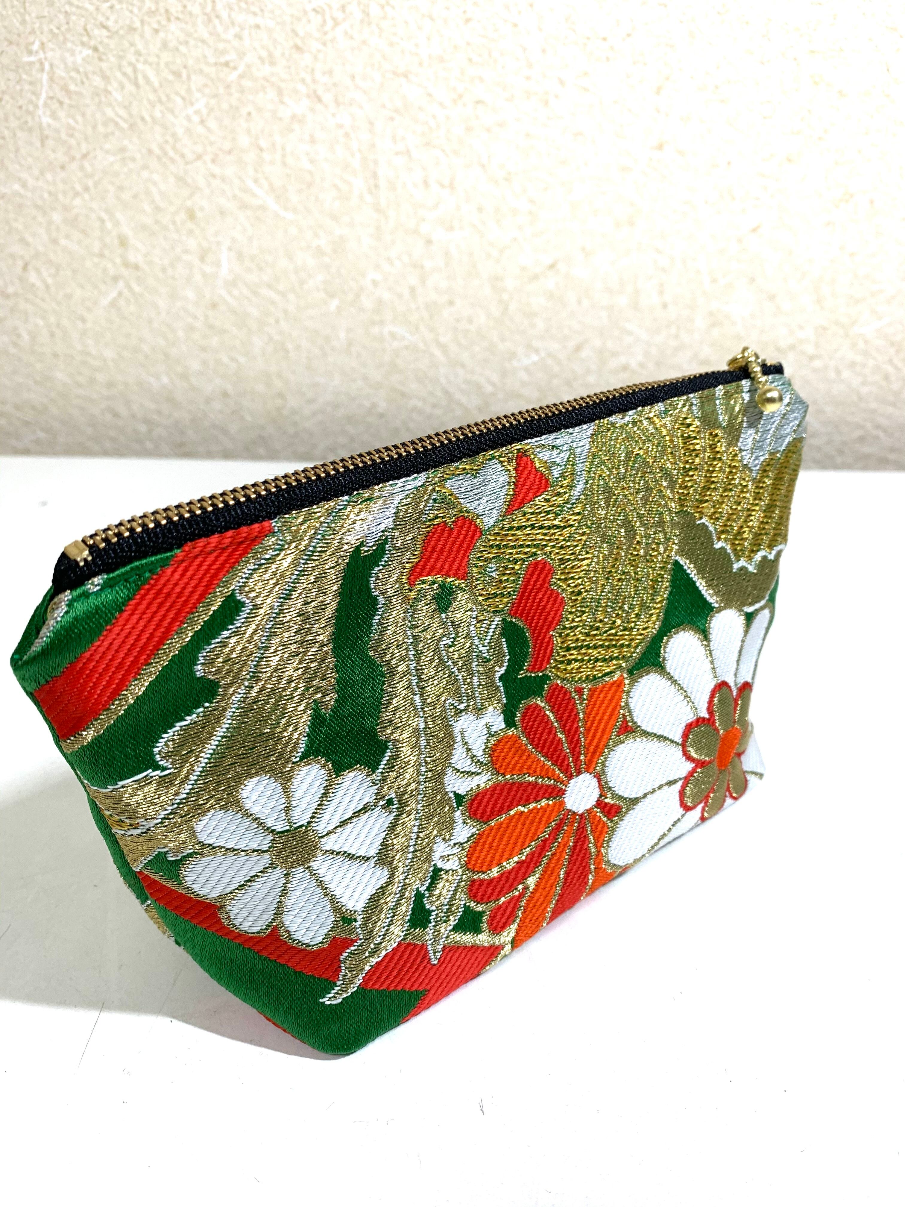 ◾️【現品1点のみ!!】HAJIME AYUMU 高級花柄付き着物帯リメイク和風デザインポーチ ハンドメイド 和風 小物入れ グリーン 鳥 花柄