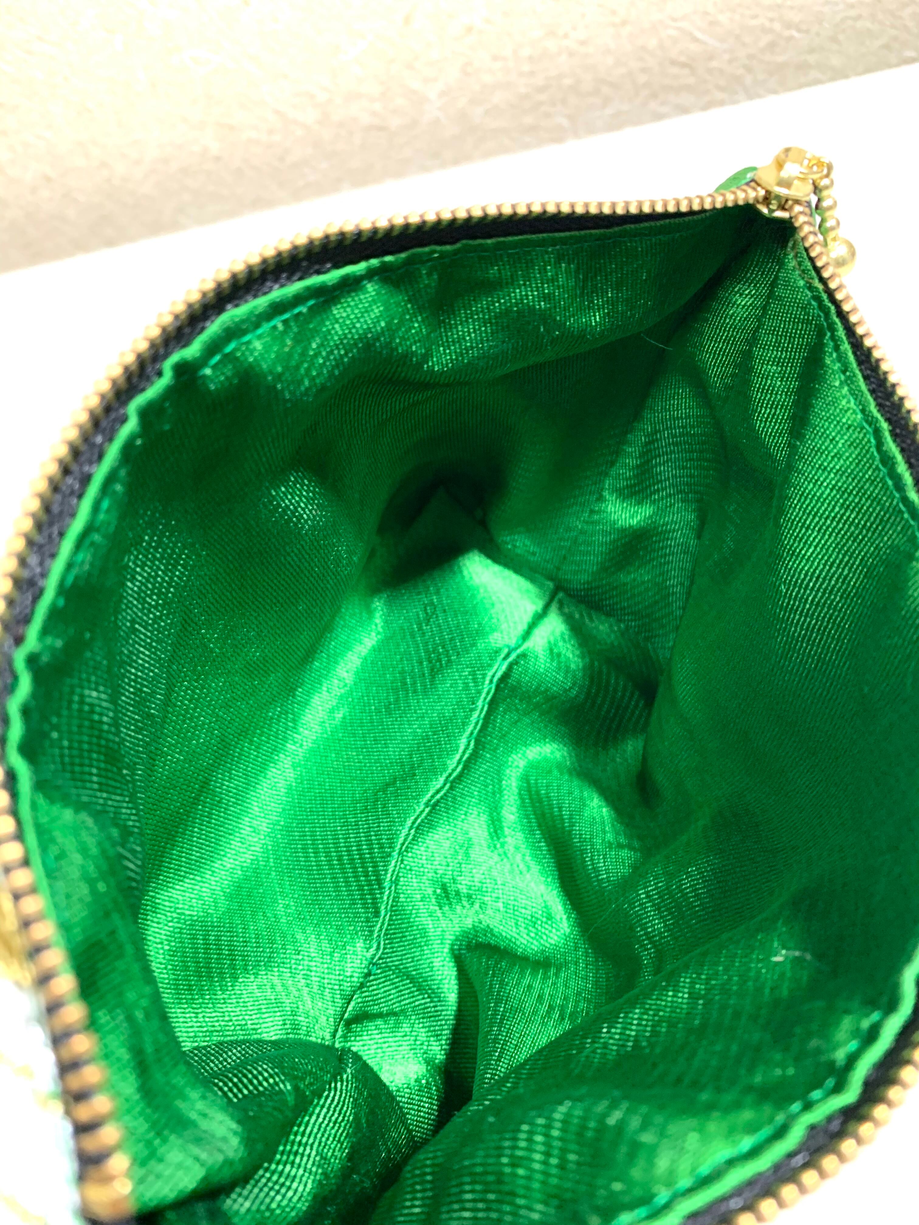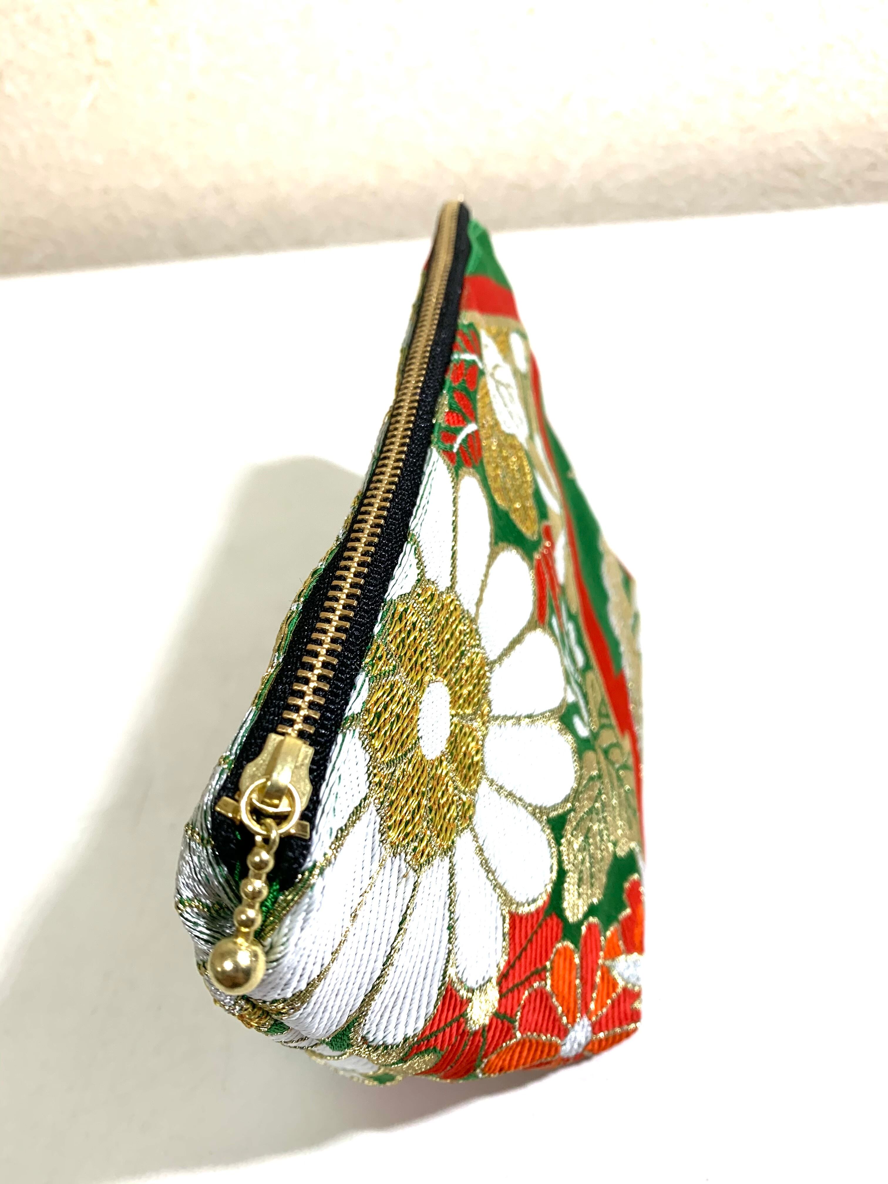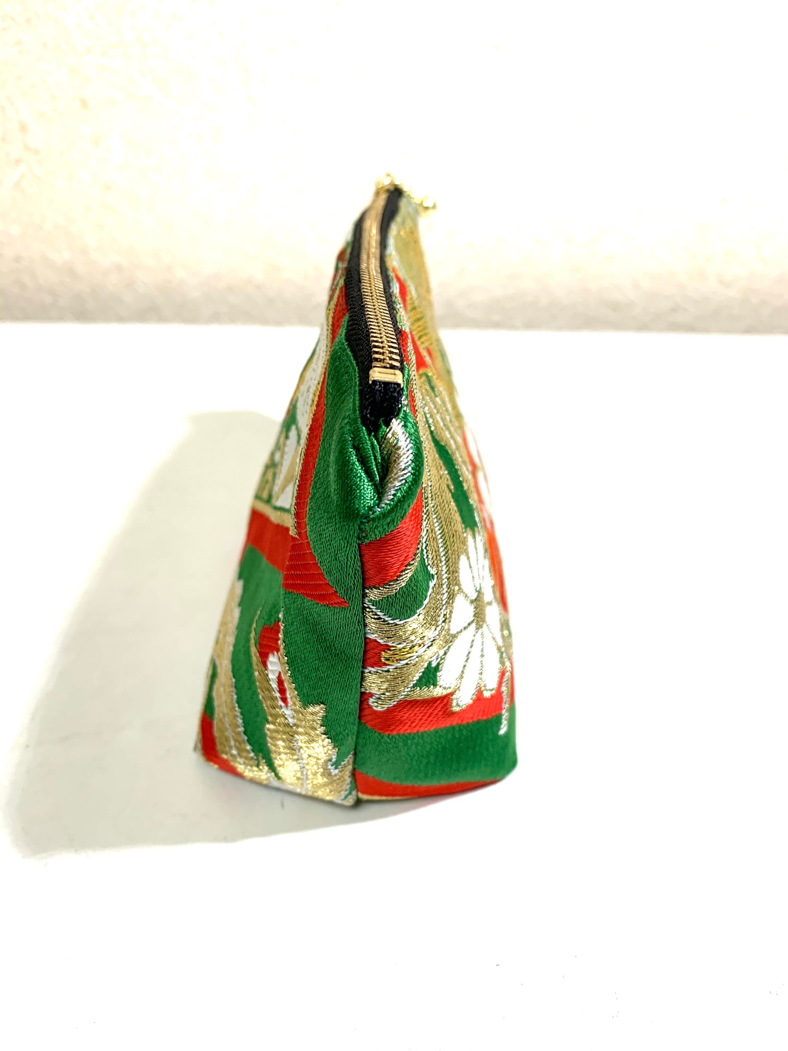 ◾️【現品1点のみ!!】HAJIME AYUMU 高級花柄付き着物帯リメイク和風デザインポーチ ハンドメイド 和風 小物入れ グリーン 鳥 花柄