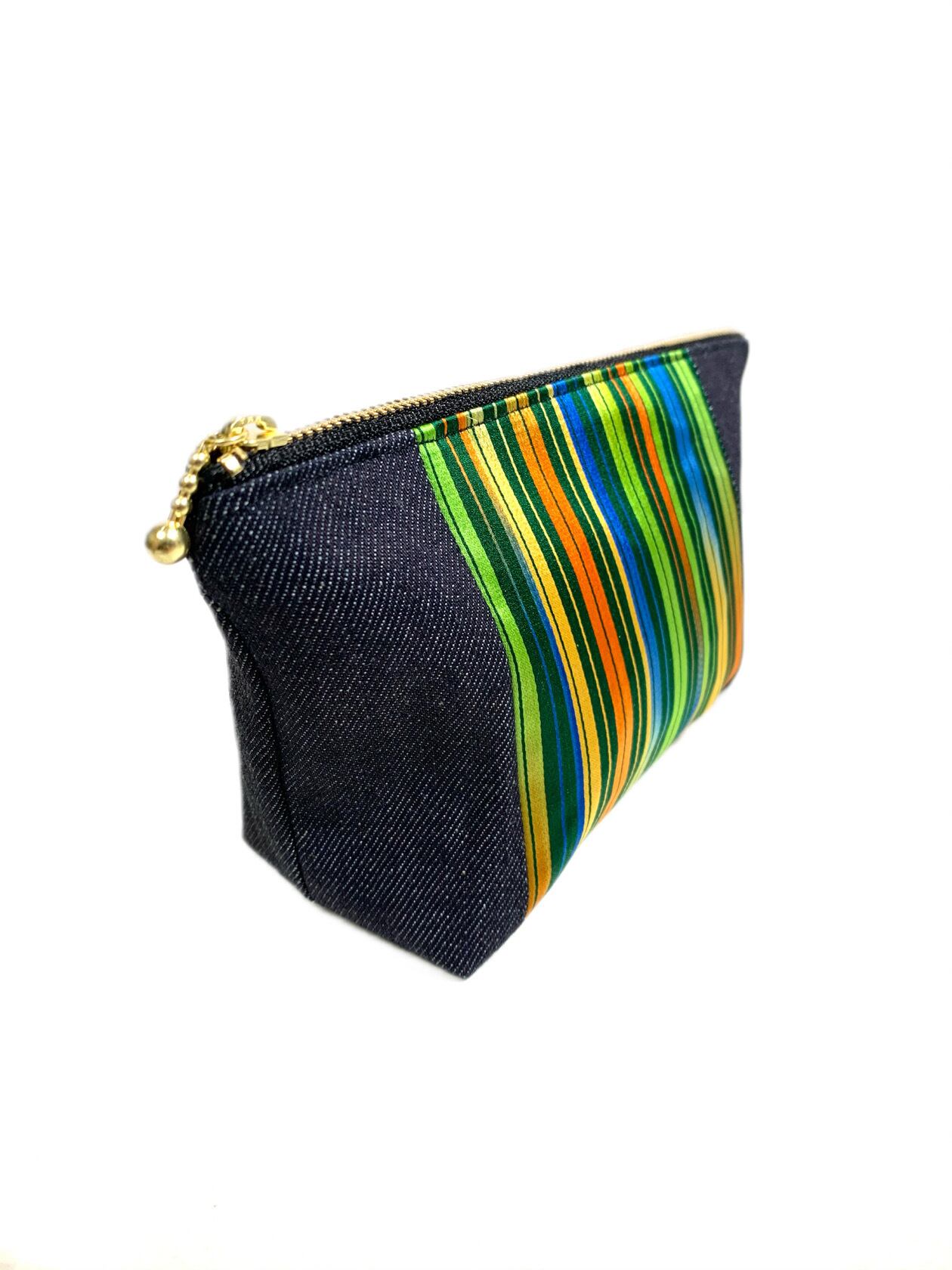 ◾️西陣織工業組合認定の鮮やかな虹色高級西陣織生地と岡山県産の児島デニム惜しみなく使ったカジュアルデザインポーチになります♪