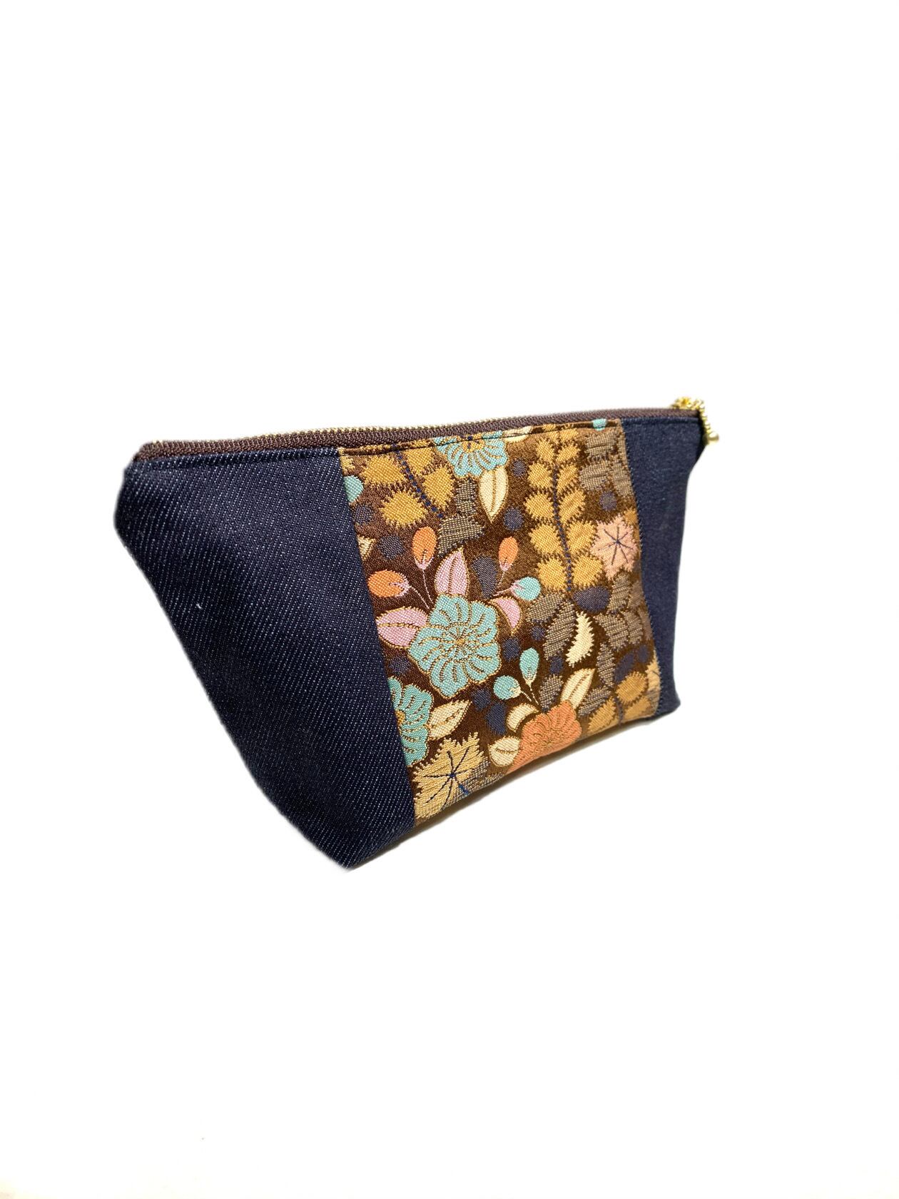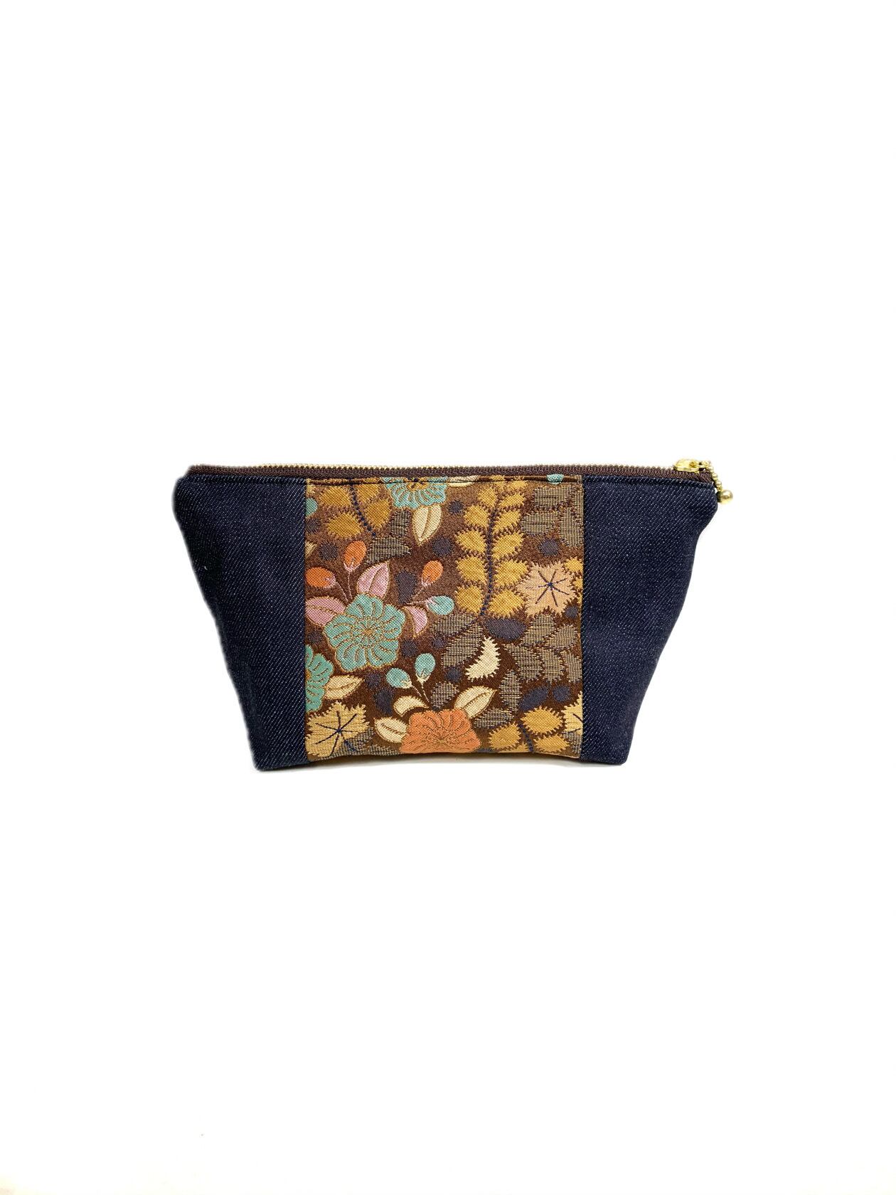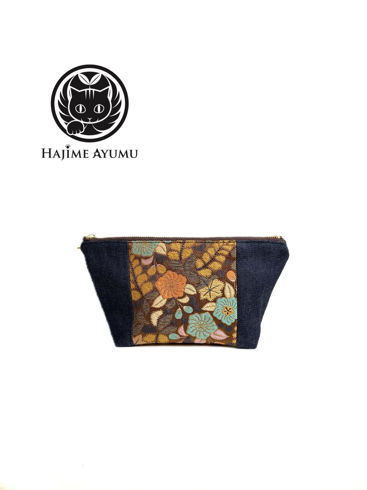 ◾️【現品1点のみ!!】HAJIME AYUMU 高級和柄付き着物帯&児島デニム リメイクデザインポーチ ハンドメイド 小物入れ 茶&紺 インディゴ