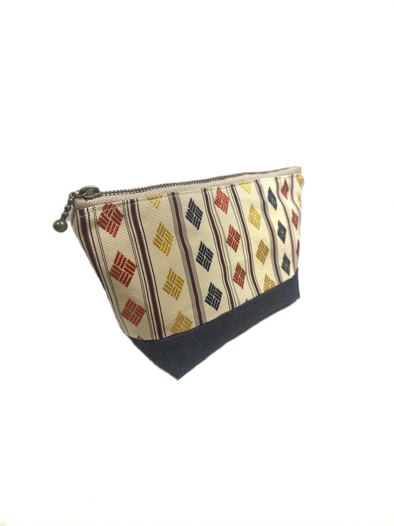 ◾️【現品1点のみ!!】HAJIME AYUMU 筑前博多織 高級和柄着物帯&児島デニムデザインポーチ2 ハンドメイド 小物入れ ベージュ