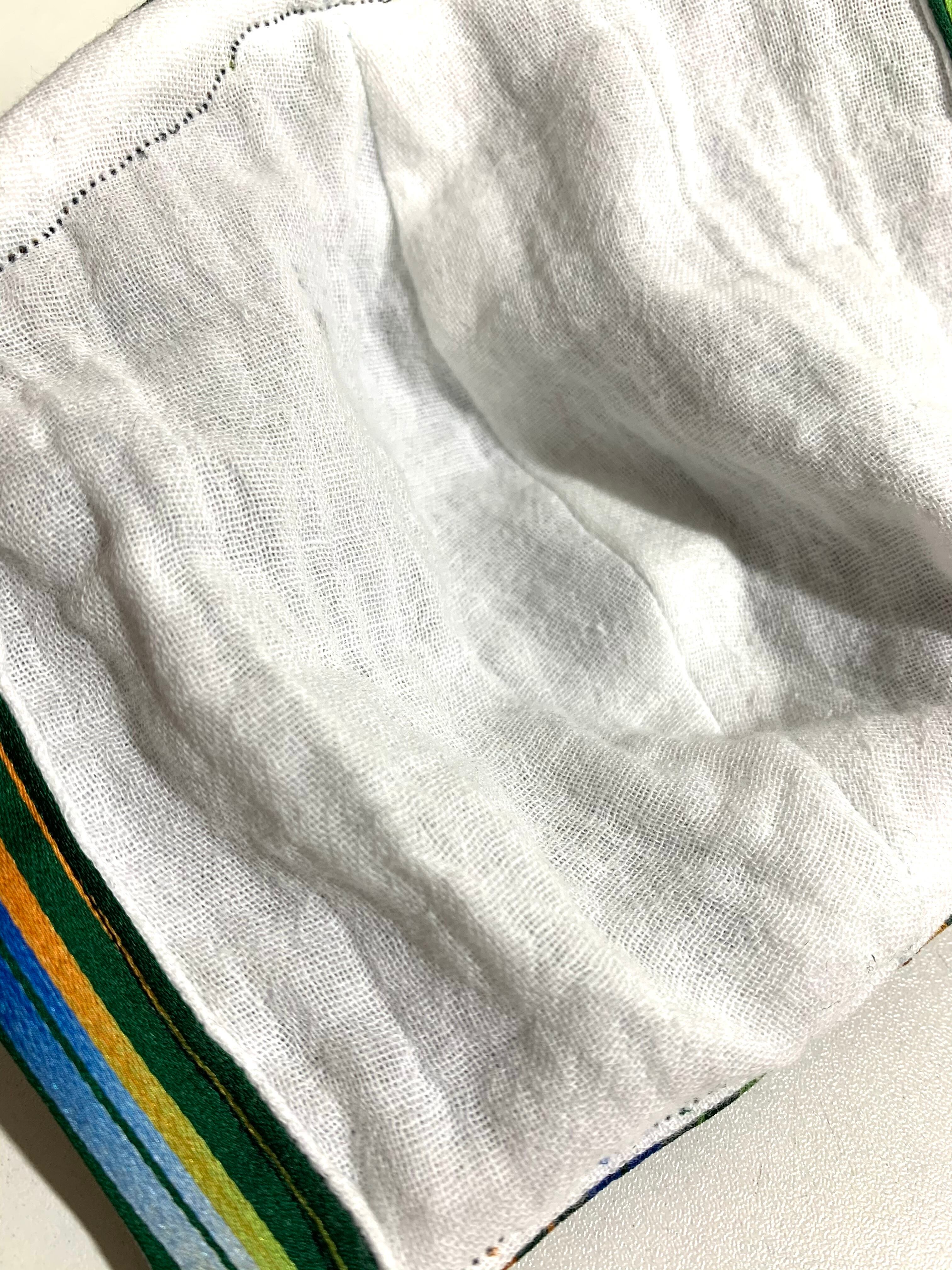 ◾️表地は、西陣織工業組合認定の鮮やかな虹色高級西陣織生地を裏は高品質のダブルガーゼを使った折り畳み式のデザインマスクになります。