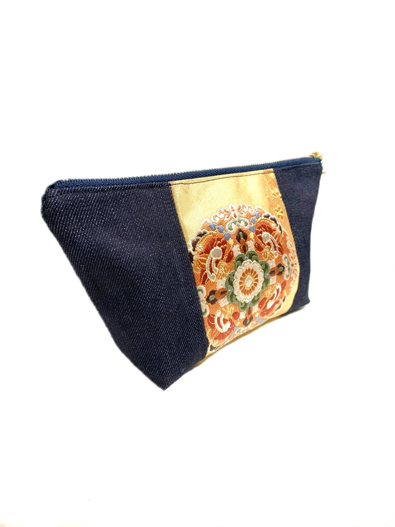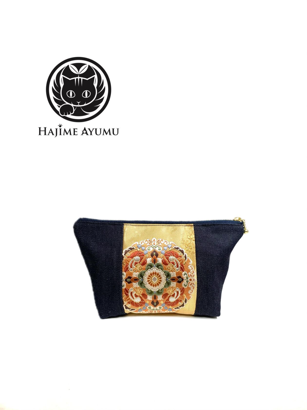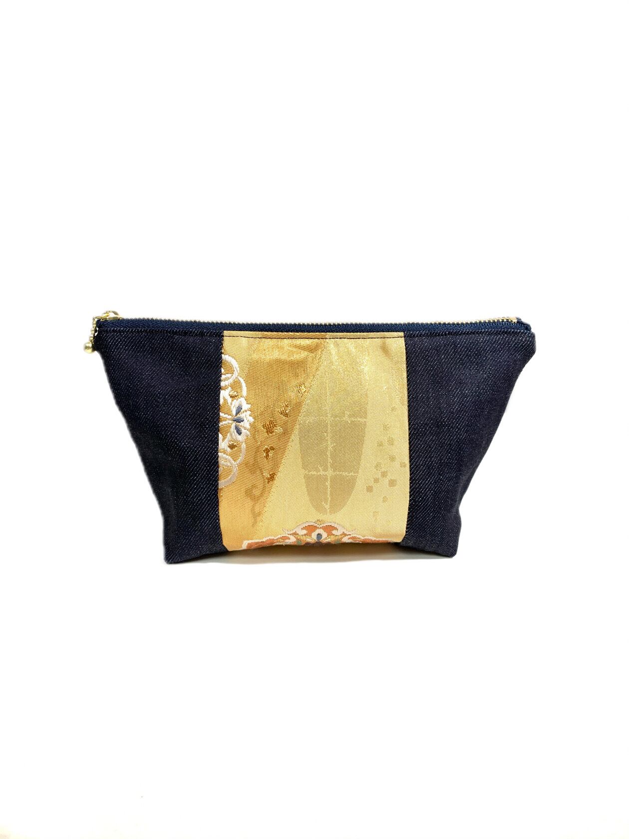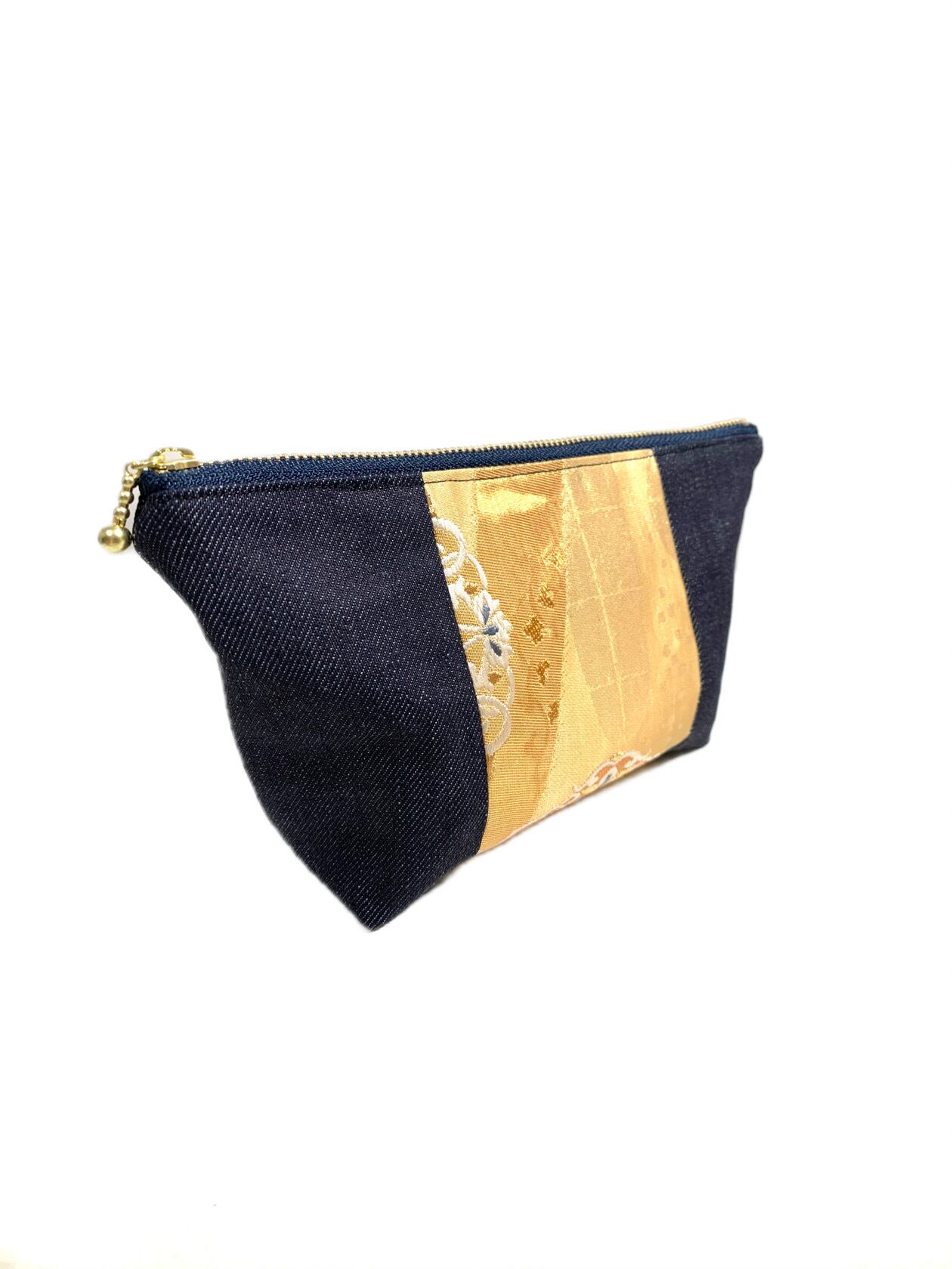 ◾️【現品1点限り‼︎】HAJIME AYUMU 高級和柄着物帯&児島デニム リメイクデザインポーチ ゴールド×ネイビー