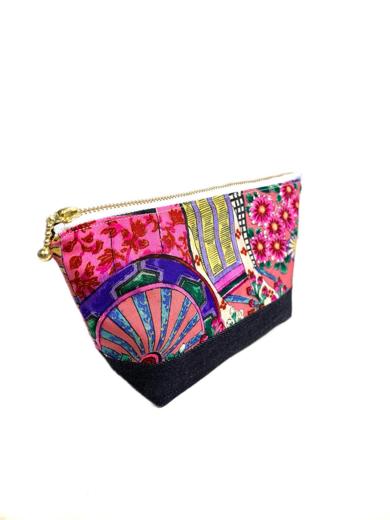 ◾️鮮やかな色合いの花柄と馬車の絵柄が組み合わさった高級和柄着物をリメイク、岡山県産児島デニムを組み合わせた和洋デザインポーチになります♪