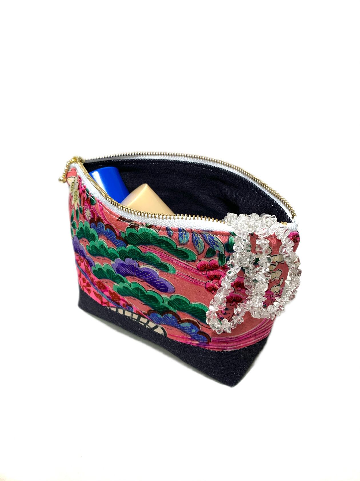 ◾️【現品1点限り‼︎】HAJIME AYUMU 高級和柄着物帯&岡山県産児島デニム リメイクデザインポーチ ピンク×ネイビー