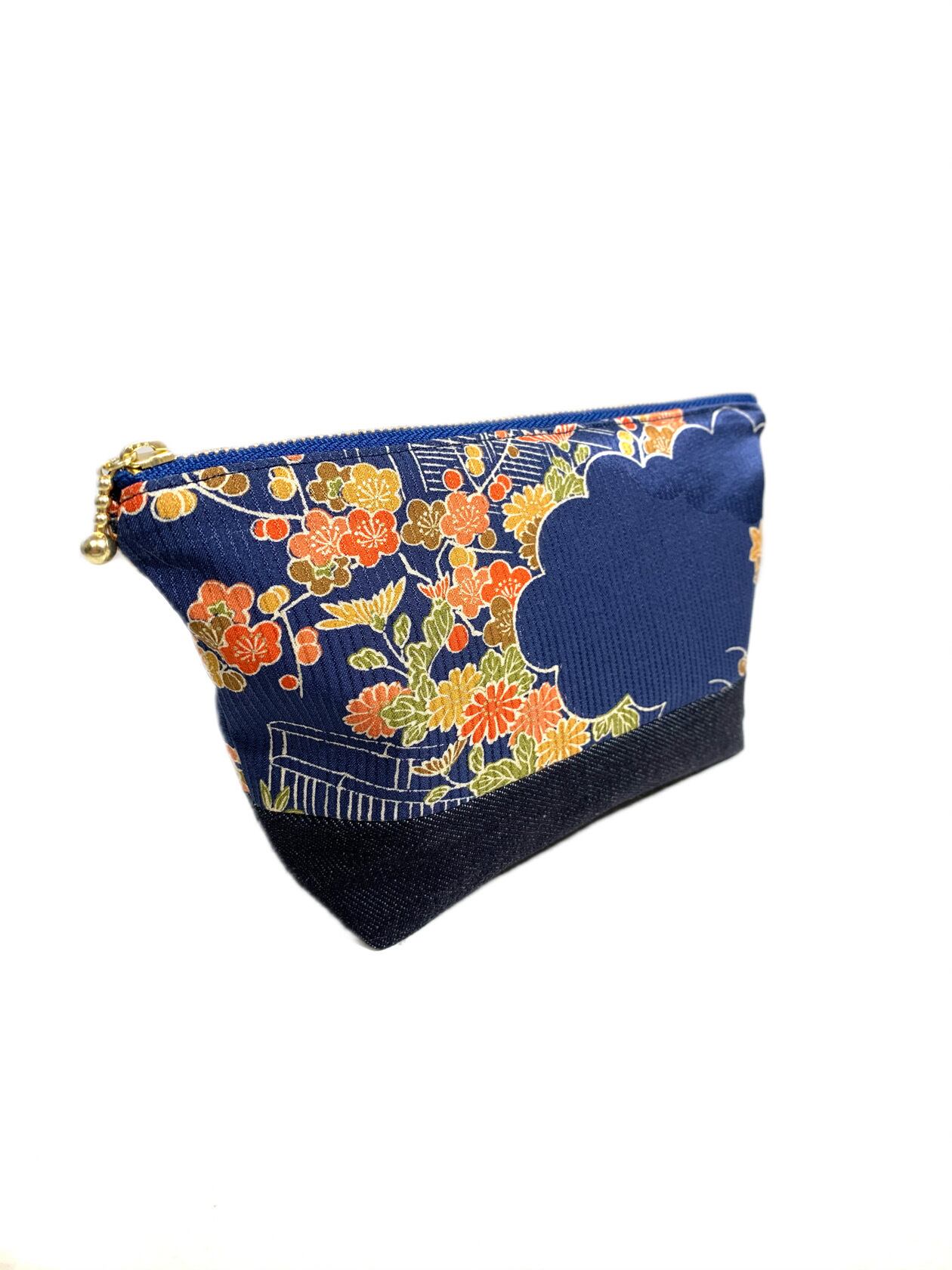 ◾️鮮やかな色合いの花柄と建築物が組み合わさった高級和柄着物をリメイク、岡山県産児島デニムを組み合わせた和洋デザインポーチになります♪