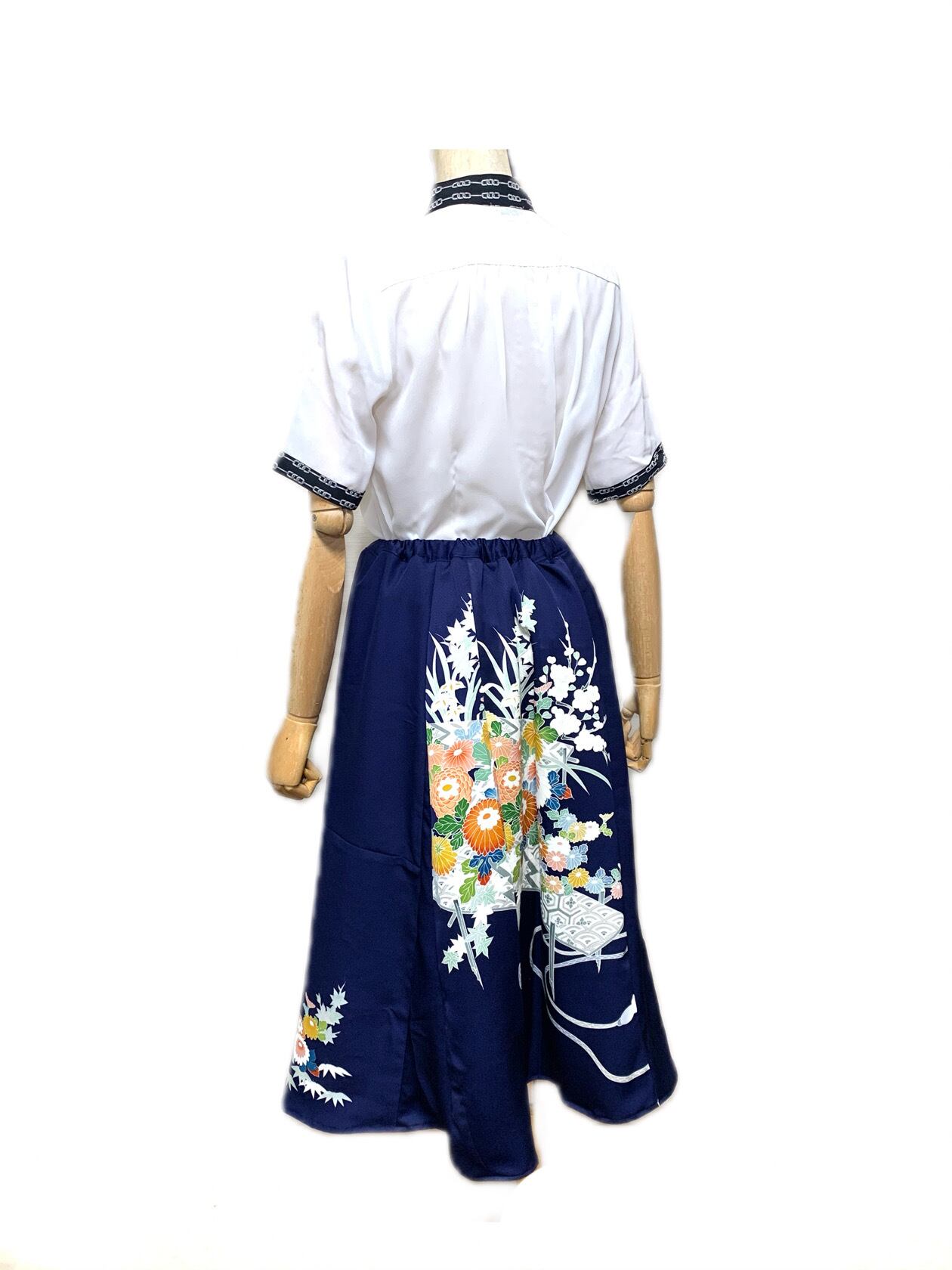 【現品1点限り‼︎】HAJIME AYUMU 高級和柄着物デザインリメイクフレアスカート ネイビー 花柄