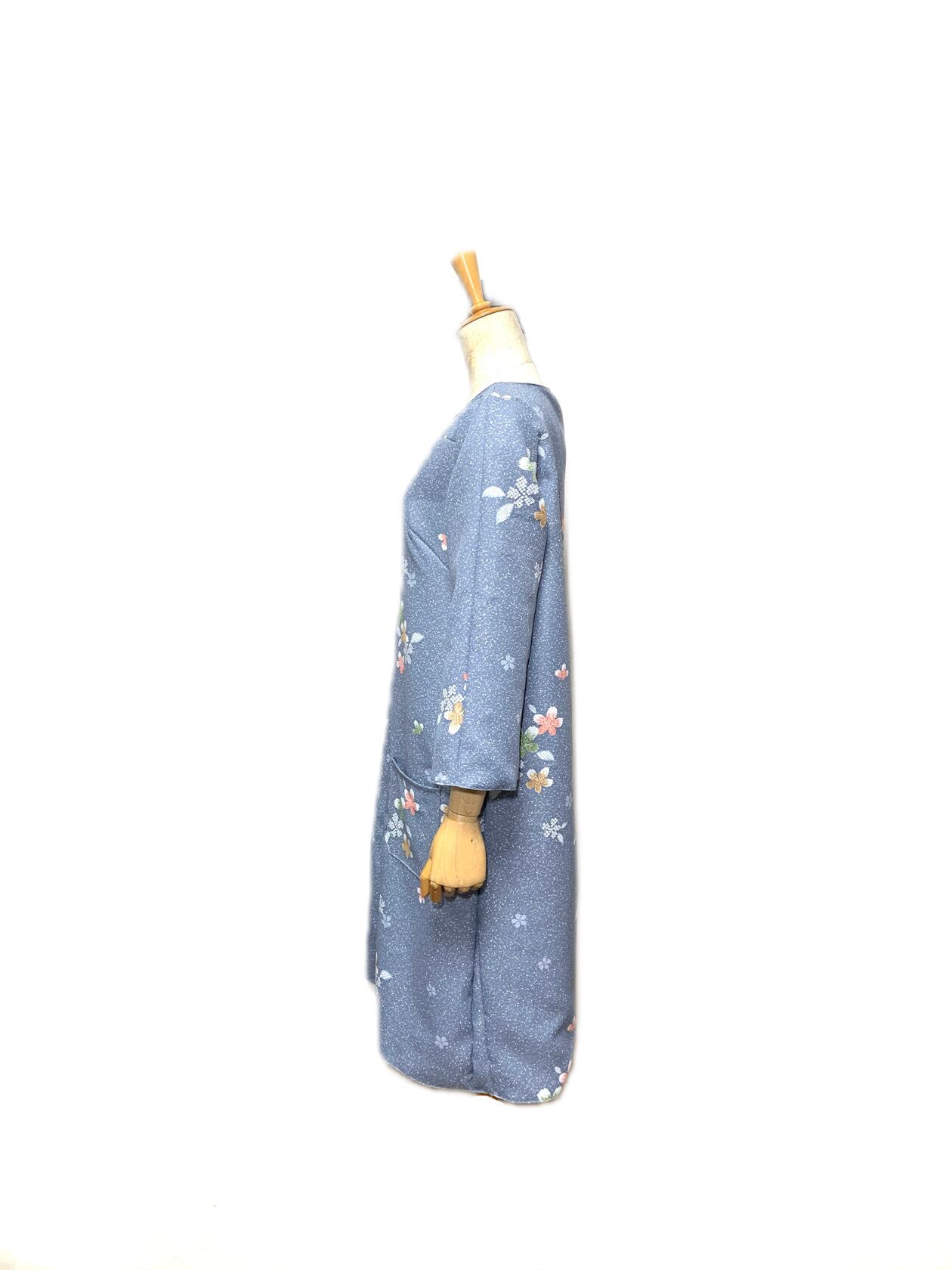 ◾️【現品1点のみ!!】HAJIME AYUMU 高級和柄付き着物リメイクデザインボートネックワンピース グレー ハンドメイド 花柄 トップス M〜L