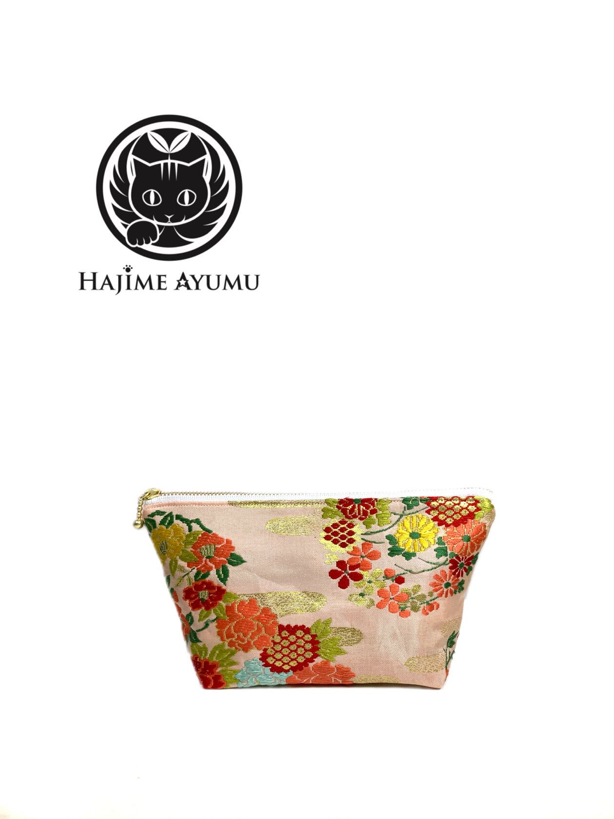 【現品1点のみ!!】HAJIME AYUMU 高級和柄付き着物帯リメイクデザインポーチ ピンク 花柄