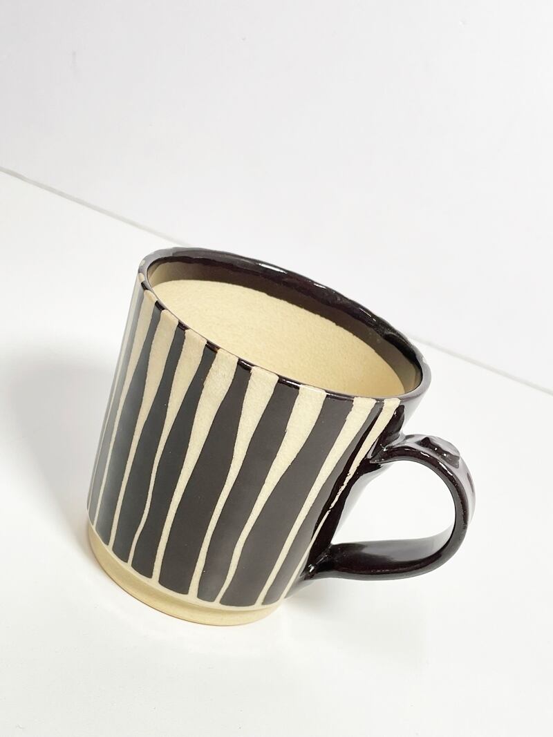 黒の縦縞が印象的なマグカップ。